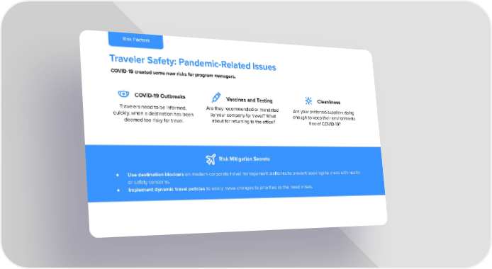 Risk Factors Traveler Safety: Pandemic-Related Issues COVID-19 created some new risks for program managers. COVID-19 Outbreaks Cleanliness Vaccines and Testing Are they recommended or mandated Travelers need to be informed, Are your preferred suppliers doing by your company for travel? What quickly, when a destination has been enough to keep their environments about for returning to the office? deemed too risky for travel. free of COVID-19? Risk Mitigation Secrets ● Use destination blockers on modern corporate travel management platforms to prevent bookings to areas with health or safety concerns. ● Implement dynamic travel policies to easily make changes to priorities as the need arises.