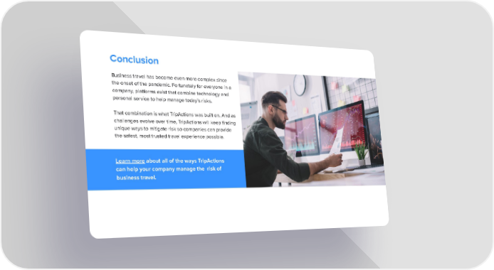 Conclusion Business travel has become even more complex since the onset of the pandemic. Fortunately for everyone in a company, platforms exist that combine technology and personal service to help manage today’s risks. That combination is what TripActions was built on. And as challenges evolve over time, TripActions will keep finding unique ways to mitigate risk so companies can provide the safest, most trusted travel experience possible. Learn more about all of the ways TripActions can help your company manage the risk of business travel.