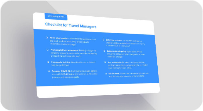 Developing a Plan Checklist for Travel Managers ❏ Know your travelers. If non-essential workers are on ❏ Determine protocols. Do you have contingency the road, are they adequately prepared with protocols and communication in place when there’s information and technology? a traveler issue or emergency? ❏ Promote platform acceptance. Booking through the ❏ Get dynamic with policy. Is your policy flexible company system is always safer; consider mandating enough to shift quickly when changes in the travel or incentivizing travelers to use it. landscape emerge? ❏ Incorporate training. Keep travelers up to date on ❏ Stay on message. Be sure travelers are receiving how to use the tool. real-time mobile alerts and messaging for any kind of issue that might require action. ❏ Consider COVID-19. Continually reevaluate policies around COVID-19 testing and vaccines to help keep ❏ Get feedback. Gather intel from returning travelers to travelers and employees safe. help define program success or improvements.