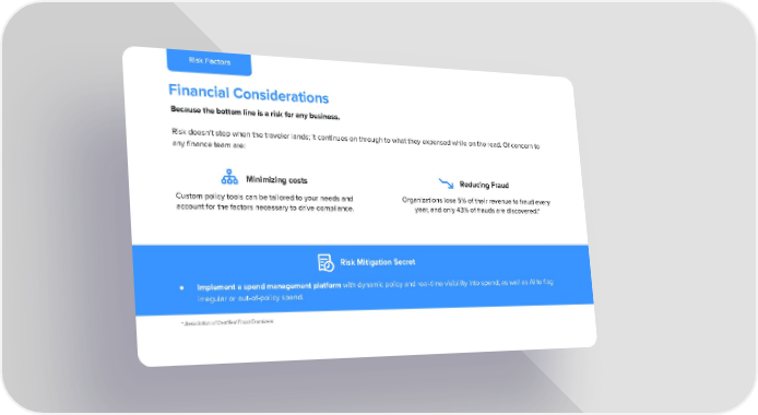 Risk Factors Financial Considerations Because the bottom line is a risk for any business. Risk doesn’t stop when the traveler lands; it continues on through to what they expensed while on the road. Of concern to any finance team are: Minimizing costs Reducing Fraud Custom policy tools can be tailored to your needs and Organizations lose 5% of their revenue to fraud every account for the factors necessary to drive compliance. year, and only 43% of frauds are discovered.* Risk Mitigation Secret ● Implement a spend management platform with dynamic policy and real-time visibility into spend, as well as AI to flag irregular or out-of-policy spend. * Association of Certified Fraud Examiners