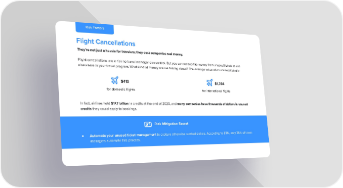 Risk Factors Flight Cancellations They’re not just a hassle for travelers; they cost companies real money. Flight cancellations are a risk no travel manager can control. But you can recoup the money from unused tickets to use elsewhere in your travel program. What kind of money are we talking about? The average value of an unused ticket is: $413 $1,384 for domestic flights for international flights In fact, airlines held $11.7 billion in credits at the end of 2020, and many companies have thousands of dollars in unused credits they could apply to bookings. Risk Mitigation Secret ● Automate your unused ticket management to capture otherwise wasted dollars. According to BTN, only 36% of travel managers automate this process.