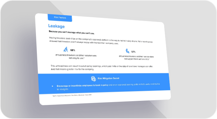 Risk Factors Leakage Because you can’t manage what you can’t see. Having travelers book trips on the company’s approved platform is the way to maintain duty of care. Yet a recent survey showed that travelers aren’t always happy with the tool their company uses. 68% 57% of business travelers said their solution was of business travelers said their service does not easy to use.* not support them well on a trip.* This unhappiness can result in out-of-policy bookings, which puts limits on the duty of care travel managers can offer. And that means greater risk for the company. Risk Mitigation Secret ● Encourage or incentivize employees to book in policy and on an approved booking platform that’s useful and intuitive to navigate. * Skift + TripActions Research: The State of Business Travel 2021