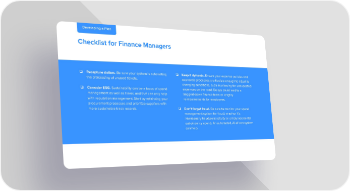 Developing a Plan Checklist for Finance Managers ❏ Recapture dollars. Be sure your system is automating ❏ Keep it dynamic. Ensure your expense policies and the processing of unused tickets. approvals processes are flexible enough to adjust to changing conditions, such as allowing for unexpected ❏ Consider ESG. Sustainability can be a focus of spend expenses on the road. Delays could lead to a management as well as travel, and that can only help bogged-down finance team or lengthy with reputation management. Start by rethinking your reimbursements for employees. procurement processes and prioritize suppliers with more sustainable track records. ❏ Don’t forget fraud. Be sure to monitor your spend management system for fraud, whether it’s intentionally fraudulent activity or simply accidental out-of-policy spend. An automated, AI-driven system can help.