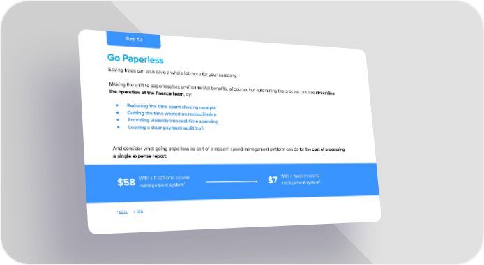 Step #2 Go Paperless Saving trees can also save a whole lot more for your company. Making the shift to paperless has environmental benefits, of course, but automating the process can also streamline the operation of the finance team, by: ● Reducing the time spent chasing receipts ● Cutting the time wasted on reconciliation ● Providing visibility into real-time spending ● Leaving a clear payment audit trail And consider what going paperless as part of a modern spend management platform can do for the cost of processing a single expense report: With a traditional spend With a modern spend $58 1 $7 2 management system management system 1. GBTA 2. BTN