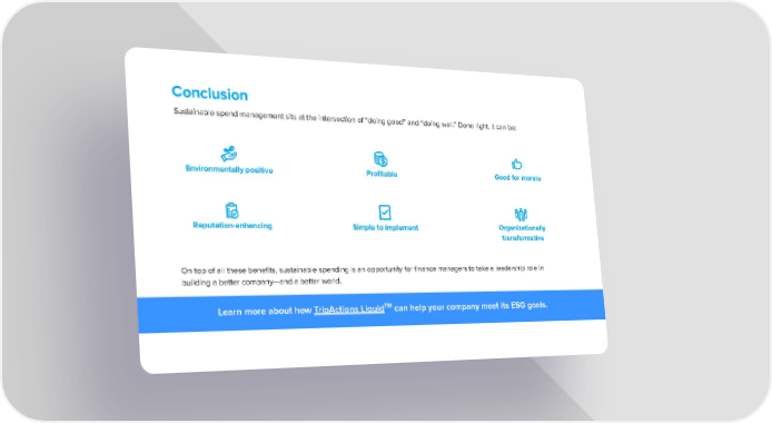 Conclusion Sustainable spend management sits at the intersection of “doing good” and “doing well.” Done right, it can be: Environmentally positive Profitable Good for morale Reputation-enhancing Organizationally Simple to implement transformative On top of all these benefits, sustainable spending is an opportunity for finance managers to take a leadership role in building a better company—and a better world. TM Learn more about how TripActions Liquid can help your company meet its ESG goals.