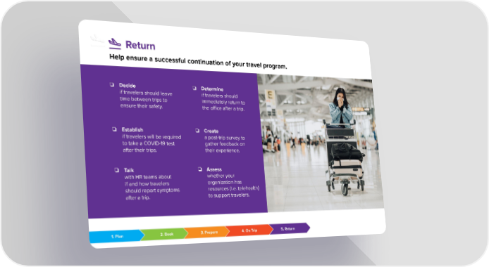 Return Help ensure a successful continuation of your travel program. ❏ Decide ❏ Determine if travelers should leave if travelers should time between trips to immediately return to ensure their safety. the office after a trip. ❏ Establish ❏ Create if travelers will be required a post-trip survey to to take a COVID-19 test gather feedback on after their trips. their experience. ❏ Assess ❏ Talk whether your with HR teams about organization has if and how travelers resources (i.e. telehealth) should report symptoms to support travelers. after a trip. 1. Plan 2. Book 3. Prepare 4. On Trip 5. Return