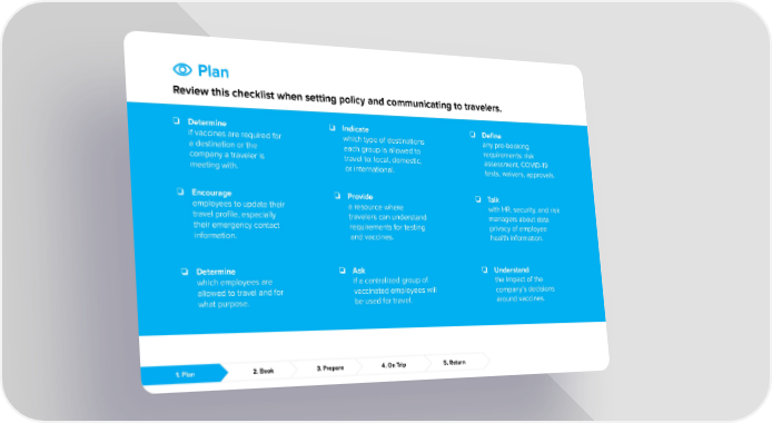 Plan Review this checklist when setting policy and communicating to travelers. ❏ Indicate ❏ Determine ❏ Define which type of destinations if vaccines are required for any pre-booking each group is allowed to a destination or the requirements: risk travel to: local, domestic, company a traveler is assessment, COVID-19 or international. meeting with. tests, waivers, approvals. ❏ Encourage ❏ Provide ❏ Talk employees to update their a resource where with HR, security, and risk travel profile, especially travelers can understand managers about data their emergency contact requirements for testing privacy of employee information. and vaccines. health information. ❏ Determine ❏ Ask ❏ Understand which employees are if a centralized group of the impact of the allowed to travel and for vaccinated employees will company’s decisions what purpose. be used for travel. around vaccines. 1. Plan 2. Book 3. Prepare 4. On Trip 5. Return