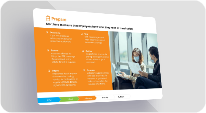 Prepare Start here to ensure that employees have what they need to travel safely. ❏ Determine ❏ Talk if you will provide or with risk managers and reimburse for personal legal department about protective equipment. insurance coverage. ❏ Review ❏ Outline expenses allowed for the preferred process for things like PPE, coverage pre-trip testing (which type if quarantined, or if a of test, where to get it, COVID-19 test is required. coverage). ❏ Consider ❏ Inform establishing partnerships employees about any new with labs and clinics for documents/technology travelers to get tested needed for destinations or before a trip, within the suppliers (COVID-19 tests, required time frame. digital health passports). 1. Plan 2. Book 3. Prepare 4. On Trip 5. Return