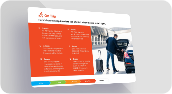 On Trip Here’s how to keep travelers top of mind when they’re out of sight. ❏ Inform ❏ Prepare travelers where to for if a traveler falls ill and get itinerary updates, like the process they should airport closures or limited follow with HR, legal, and in-flight services. risk management teams. ❏ Indicate ❏ Review if modes of transportation, your meal per diem, like rideshare or public especially if hotel dining transport, will be limited. is limited. ❏ Review ❏ Decide your on-trip support on a process for remote resources and alerts in traveler testing in the case of border closures, event of potential outbreaks, or changes to COVID-19 exposure travel requirements. while on a trip. 1. Plan 2. Book 3. Prepare 4. On Trip 5. Return