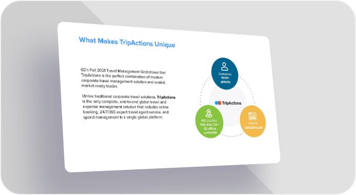 What Makes TripActions Unique Customers G2’s Fall 2021 Travel Management Grid shows that 5000+ TripActions is the perfect combination of modern globally corporate travel management solution and scaled, market-ready leader. Unlike traditional corporate travel solutions, TripActions is the only complete, end-to-end global travel and TripActions expense management solution that includes online booking, 24/7/365 expert travel agent service, and spend management in a single global platform. HQ Location Website Palo Alto, CA + TripActions.com 22 offices worldwide