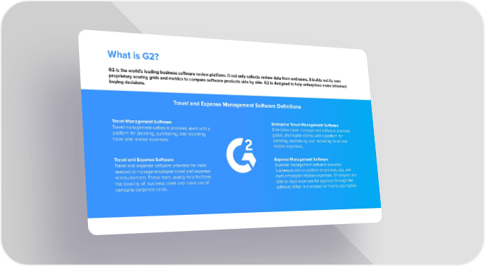 What is G2? G2 is the world’s leading business software review platform. It not only collects review data from end users, it builds out its own proprietary scoring grids and metrics to compare software products side by side. G2 is designed to help enterprises make informed buying decisions. Travel and Expense Management Software Definitions Travel Management Software Enterprise Travel Management Software Travel management software provides users with a Enterprise travel management software provides platform for planning, purchasing, and recording global, distributed clients with a platform for travel and related expenses. planning, purchasing, and recording travel and related expenses. Travel and Expense Software Expense Management Software Travel and expense software provides the tools Expense management software provides needed to manage employee travel and expense businesses with a platform to process, pay, and reimbursement. These tools usually help facilitate audit employee-initiated expenses. Employees are the booking of business travel and make use of able to input expenses for approval through the company corporate cards. software either in a browser or mobile application.