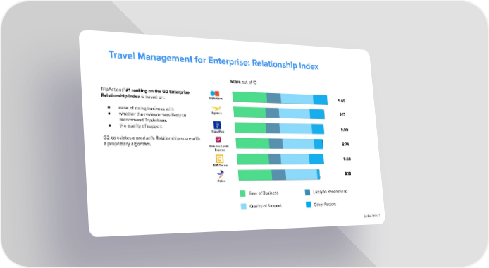 Travel Management for Enterprise: Relationship Index Score out of 10 TripActions’ #1 ranking on the G2 Enterprise 9.65 TripActions Relationship Index is based on: Divvy ● ease of doing business with 9.17 Egencia ● whether the reviewer was likely to recommend TripActions ● the quality of support 9.00 TravelPerk G2 calculates a product’s Relationship score with 8.74 a proprietary algorithm. Emburse Certify Expense 8.69 SAP Concur 8.13 Rydoo Ease of Business Likely to Recommend Quality of Support Other Factors G2 Fall 2021 | 7