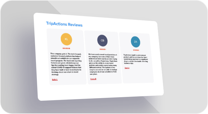 TripActions Reviews KL CB ZA This company gets it. The tech-forward, We have used several travel providers at TripActions Liquid is a phenomenal customer-focused platform has helped my company, but none of them have product, and has cut down the time I smooth out wrinkles in our corporate understood what exactly we were trying spend doing expenses to a significant travel program. The back-end reporting to do as well as TripActions. TripActions degree, which is invaluable after long features are great, which keeps our gives us the ability to create travel business trips. Ops/Accounting team happy. And the policies and analyze spend using many added COVID-19 support features that different metrics. The system is very Zach A they have built in have been helpful in easy to use and we are able to manage thinking about our return to travel employees in all our subsidiaries from strategy. one place. Kelly L Corey B