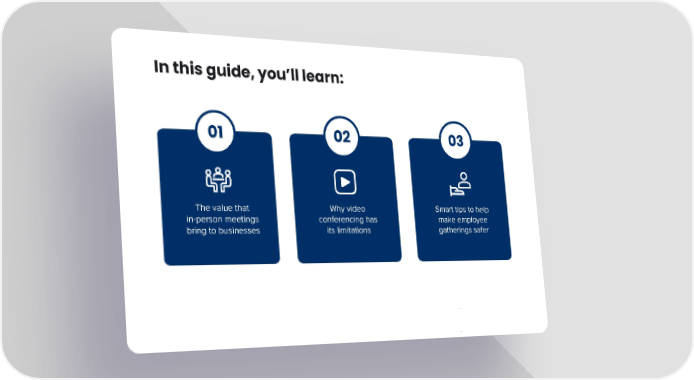 In this guide, you’ll learn: 01 02 03 The value that Why video Smart tips to help in-person meetings conferencing has make employee bring to businesses its limitations gatherings safer