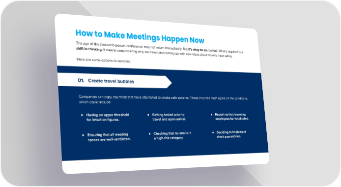 How to Make Meetings Happen Now The age of the thousand-person conference may not return immediately. But it’s okay to start small. What’s required is a shift in thinking. It means remembering why we travel and coming up with new ideas about how to meet safely. Here are some options to consider. 01. Create travel bubbles Companies can copy countries that have attempted to create safe spheres. Those involved must agree on the conditions, which could include: ● Having an upper threshold ● Getting tested prior to ● Requiring that traveling for infection figures. travel and upon arrival. employees be vaccinated. ● Ensuring that all meeting ● Checking that no one is in ● Deciding to implement spaces are well-ventilated. a high-risk category. short quarantines.