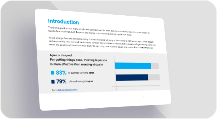 Introduction There’s no question that many people who used to travel for work miss the connection, experience, and texture of face-to-face meetings. And they miss the change in surroundings that can spark new ideas. As we emerge from the pandemic, many business travelers will jump at the chance to hit the road again, when it’s safe and responsible. Yes, there will be issues to consider and problems to resolve. But economies will get moving again, and so will the people and ideas that drive them. We can bring back business travel—and ensure that it’s better than ever. Agree or disagree? For getting things done, meeting in person is more effective than meeting virtually. of business travelers agree 83% of travel managers agree 79% Source: Skift and TripActions survey