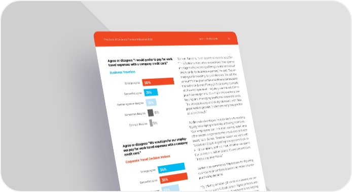 The State of Corporate Travel and Expense 2022 20 SKIFT + TRIPACTIONS Agree or disagree: “I would prefer to pay for work travel expenses with a company credit card.” Agree or disagree: “We would prefer our employ - ees pay for work travel expenses with a company credit card.” Strongly agree Somewhat agree Neither agree or disagree Somewhat disagree Strongly disagree Strongly agree Somewhat agree Neither agree or disagree Somewhat disagree Strongly disagree Business Travelers Corporate Travel Decision Makers Barker, for one, is on board with this solution. “TripActions has also expedited the spend management process by offering on-demand virtual credit cards for business expenses,” he said. “Say an employee is traveling to a conference. We set the amount for the given airfare and other expenses, send them the card, and off they go. It’s instantly trackable at the employee level. I regularly use this solution to purchase equipment. It’s a major improvement over issuing and managing traditional corporate cards. The process is easy and straightforward, with little paperwork to provide. TripActions really thought this solution through.” Additional advantages include tie-ins to existing loyalty reward programs and purchasing incentives. “Our employees can link their airline, hotel, and other reward programs to the virtual card and earn credit,” said Barker. “Another reason we went with TripActions Liquid is getting one percent back on all of our spend, with no limit. Whether we spend five dollars or a million dollars, it’s one percent back. That’s a big driver for us.” Barker also commends TripActions for f iguring out how to incentivize travelers to make smarter purchasing decisions. “By offering Amazon gift cards as a reward, we can push our users to book certain flights or hotels and not overspend,” he said. “TripActions is not helping us def ine spend management policy, but shape spending behavior that we like.” 16% 22% 50% 34% 21% 35% 8% 6% 5% 3%