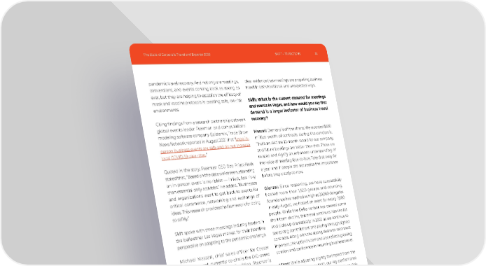 The State of Corporate Travel and Expense 2022 33 SKIFT + TRIPACTIONS pandemic travel recovery. And not only are meetings, conventions, and events coming back as strong as ever, but they are helping to establish the efficacy of mask and vaccine protocols in creating safe, low-risk environments. Citing findings from a research partnership between global events leader Freeman and computational modeling software company Epistemix, Trade Show News Network reported in August 2021 that “ large in- person business events are safe and do not increase local COVID-19 case rates .” Quoted in the story, Freeman CEO Bob Priest-Heck stated that, “Based on the data we’ve seen, attending an in-person event is no riskier — in fact, less risky than essential daily activities.” He added, “Businesses and organizations want to get back to events for critical commerce, networking and exchange of ideas. This research provides the f ramework for doing so safely.” Skift spoke with three meetings industry leaders in the bellwether Las Vegas market for their f rontline perspective on adapting to the pandemic challenge. Michael Massari, chief sales off icer for Caesar Entertainment, currently co-chairs the D.C.-based Meetings Means Business Coalition. Stephanie Glanzer is chief sales officer & senior vice president of sales for MGM Resorts International. Chandra Allison is senior vice president of sales for The Venetian Resort Las Vegas. Together, they manage a combined 8.4 million-plus square feet of group space supported by nearly 88,000 hotel rooms in Vegas alone. With yet more inventory in regional markets across the U.S. and abroad, the trio, in ordinary times, is responsible for thousands of annual meetings, conferences, conventions, and events worth hundreds of millions of dollars in revenues. From an uptick in creative ways to keep remote workers connected and engaged, to higher f requency strategic and collaborative events, there is clear evidence that meetings are propelling business travel in both traditional and unexpected ways. Skift: What is the current demand for meetings and events in Vegas, and how would you say that demand is a larger indicator of business travel recovery? Massari: Demand is off the charts. We recorded $600 million worth of contracts during the pandemic. That’s an all-time 12-month record for our company, and future bookings are better than ever. Those are related and signify an enhanced understanding of the value of meeting face-to-face. Take that away for a year and if people did not realize the importance before, they clearly do now. Glanzer: Since reopening, we have successfully hosted more than 1,500 groups and counting. Attendance has reached as high as 20,000 delegates. In early August, we hosted an event for nearly 7,000 people. While the Delta variant has caused some short-term decline, this trend continues into the fall and picks up dramatically in 2022 as we continue to see strong commitment and pacing through signed contracts. Along with the strong desire to reconnect in person, the uptick in demand also reflects growing comfort and confidence in resuming business travel. Allison: While adjusting slightly for impact f rom the Delta variant in the near term, our key performance indicators such as lead volume, site inspections, pre- planning, and business pace were all at or exceeding 2019 levels. As vaccination requirements and other factors rapidly change the environment, we remain encouraged by the high business demand. Skift: What factors are currently driving business travel? Glanzer: I think that there is an emotional component, a feeling. People are rediscovering, or realizing for the first time, true appreciation for getting back together in person. From a business standpoint, another element which we have heard