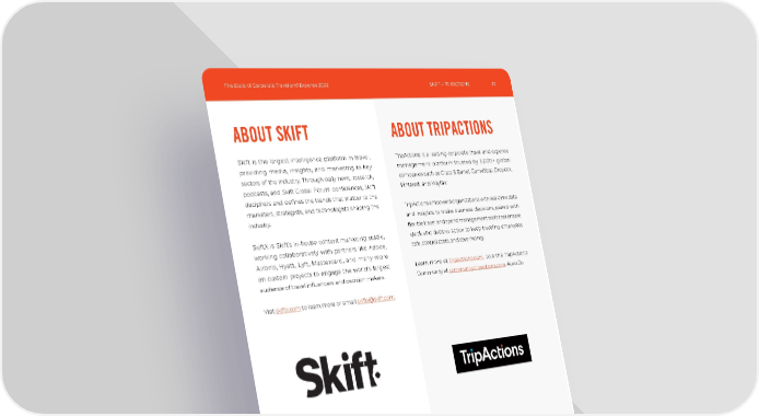 The State of Corporate Travel and Expense 2022 39 SKIFT + TRIPACTIONS ABOUT SKIFT ABOUT TRIPACTIONS Skift is the largest intelligence platform in travel, providing media, insights, and marketing to key sectors of the industry. Through daily news, research, podcasts, and Skift Global Forum conferences, Skift deciphers and defines the trends that matter to the marketers, strategists, and technologists shaping the industry. SkiftX is Skift’s in-house content marketing studio, working collaboratively with partners like Adobe, Airbnb, Hyatt, Lyft, Mastercard, and many more on custom projects to engage the world’s largest audience of travel influencers and decision makers. TripActions is a leading corporate travel and expense management platform trusted by 5,000+ global companies such as Crate & Barrel, GameStop, Dropbox, Pinterest, and Wayfair. TripActions empowers organizations with real-time data and insights to make business decisions, paired with flexible travel and spend management tools that enable quick and decisive action to keep traveling employees safe, control costs, and save money. Learn more at tripactions.com . Join the TripActions Community at community.tripactions.com . #LetsGo Visit skiftx.com to learn more or email [email protected].