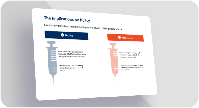 The Implications on Policy Here’s how travel and finance managers feel about building policy around: ✓ Testing ✓ Vaccinations 49% believe it’s good policy to 47% said it’s good policy to ask mandate COVID-19 testing before employees to get a COVID-19 letting employees travel for work. vaccination before travel. 15% believe COVID-19 testing 78% said they don’t have the legal mandates in general are bad authority to require employees to policy. be vaccinated.