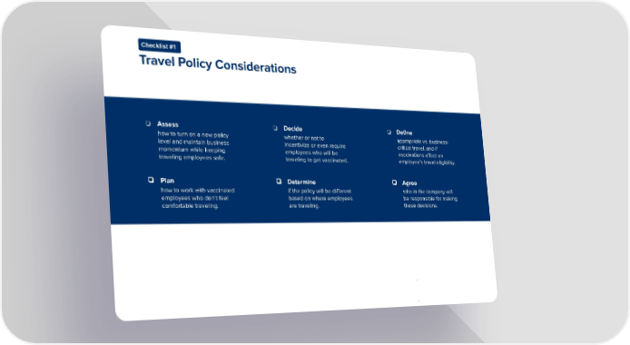 Checklist #1 Travel Policy Considerations ❏ Assess ❏ Decide ❏ Define how to turn on a new policy whether or not to appropriate vs. business- level and maintain business incentivize or even require critical travel, and if momentum while keeping employees who will be vaccinations affect an traveling employees safe. traveling to get vaccinated. employee’s travel eligibility. ❏ Plan ❏ Determine ❏ Agree how to work with vaccinated If the policy will be different who in the company will employees who don’t feel based on where employees be responsible for making comfortable traveling. are traveling. these decisions.